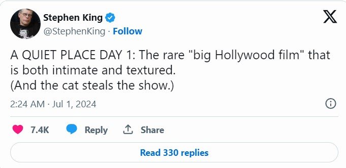 Ο Stephen King και η tweet/κριτική 2 γραμμών για το «A Quiet Place: Day One»